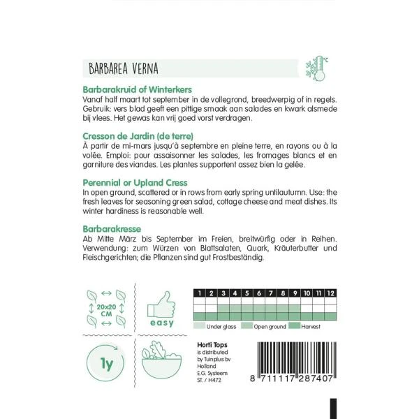 Zaaien vanaf half- maart tot september in volle grond, breedwerpig of in regels. Gebruik: vers blad geeft een pittige smaak aan salades, kwark en gaat uitstekend samen met een goed vleesgerecht. Kan vrij goed tegen vorst.