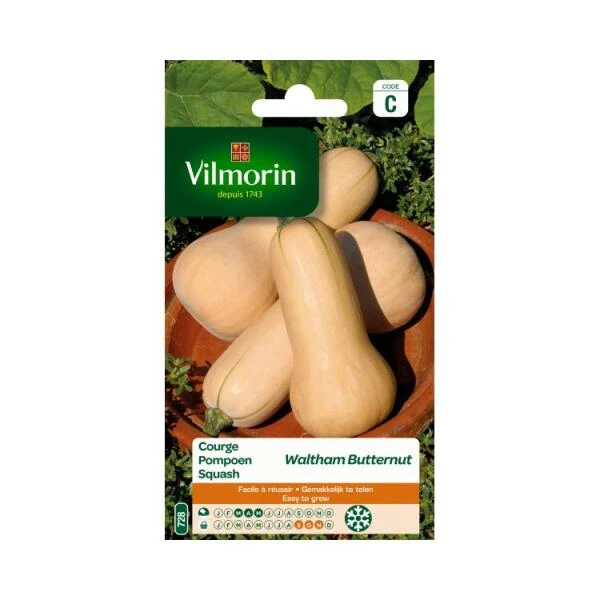 Variëteit Waltham Butternut met geel-oranje, smaakvol en gesuikerd vruchtvlees.